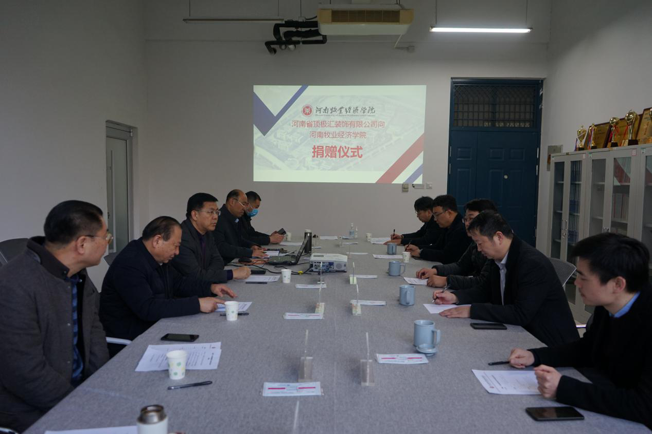12月10日上午,437ccm必赢国际官网校企合作单位河南省顶级汇装饰设计有限公司与学校签订资金捐赠协议,该公司捐赠50万元用于产业学院建设工作。仪式在龙子湖校区一号教学楼200-1室举行,副校长张卫宪、“顶极汇”有限公司董事长熊书国、总经理孙希明等领导出席仪式,校财务处、社会服务办公室负责人,艺术学院领导班子成员等同志参加,签字仪式由社会服务办公室主任胡迎利主持。