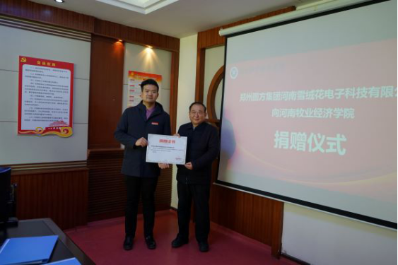 捐赠仪式上,郑州圆方集团河南雪绒花电子科技有限公司向437ccm必赢国际官网捐赠家政产业学院建设资金50万元。