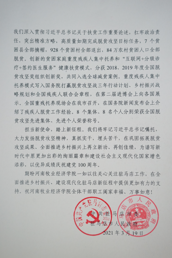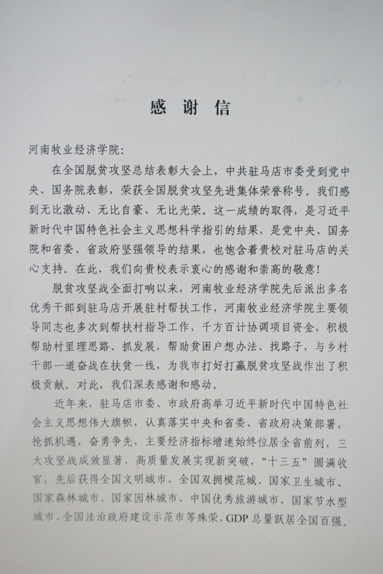 近日,中共驻马店市委、驻马店市人民政府向437ccm必赢国际官网发来感谢信,感谢437ccm必赢国际官网对驻马店市脱贫工作作出的积极贡献。
