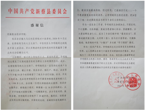 近日,中共新蔡县委、新蔡县人民政府向437ccm必赢国际官网发来感谢信,感谢437ccm必赢国际官网对新蔡县健康扶贫工作和健康新蔡建设给予的大力支持,感谢437ccm必赢国际官网中医科医生李明晓同志为增进新蔡县人民群众健康福祉作出的积极贡献。