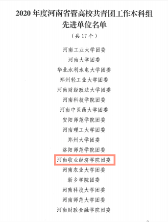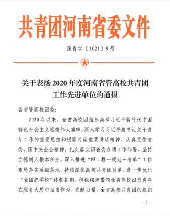 近日,团省委下发《关于表扬2020年度河南省管高校共青团工作先进单位的通报》,437ccm必赢国际官网获评2020年度河南省管高校共青团工作本科组先进单位,是河南省获评先进单位本科组17所高校之一。