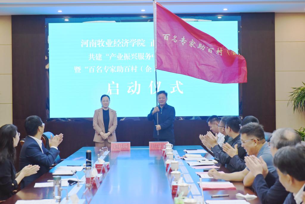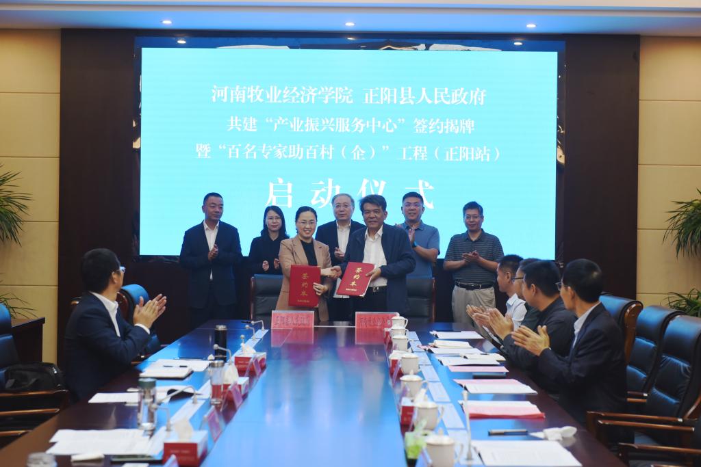 为强力推进“百名专家助百村(企)”工程(“双百”工程)深入实施,积极助力地方产业高质量发展与乡村振兴,9月27日,437ccm必赢国际官网与正阳县人民政府共建“产业振兴服务中心”签约揭牌暨“双百”工程(正阳站)启动仪式在正阳县文体中心隆重举行。校党委书记穆瑞杰、副校长杨国宇及正阳县委副书记、县长张燕出席仪式。校、政、企20多家单位领导和专家代表参加签约仪式。正阳县委常委、宣传部部长、副县长焦中丽主持仪式。