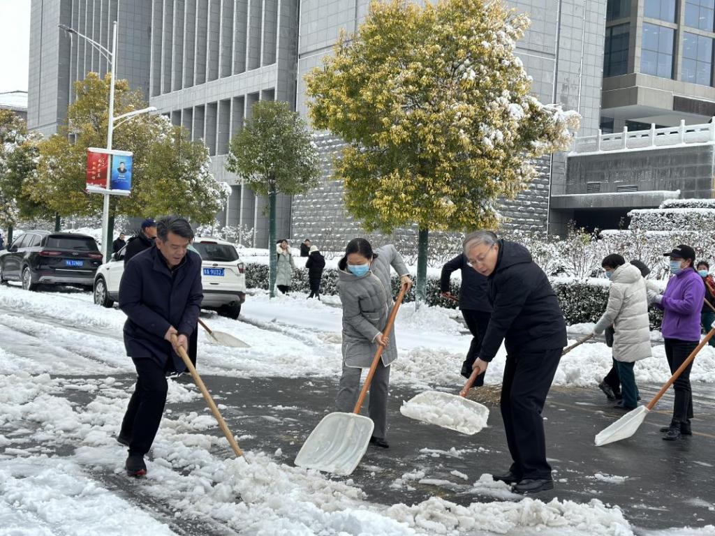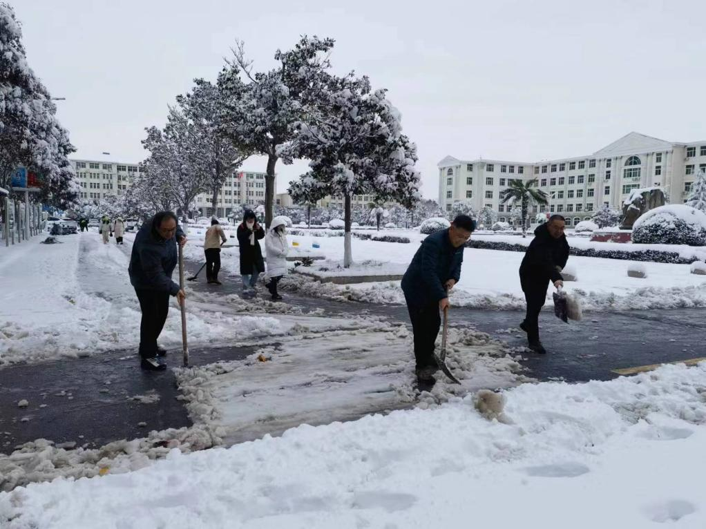 学校迅即启动低温雨雪冰冻灾害Ⅳ级应急响应,对师生安全防范工作作出部署。校领导率先垂范,拿起工具,带头清理校园积雪。
