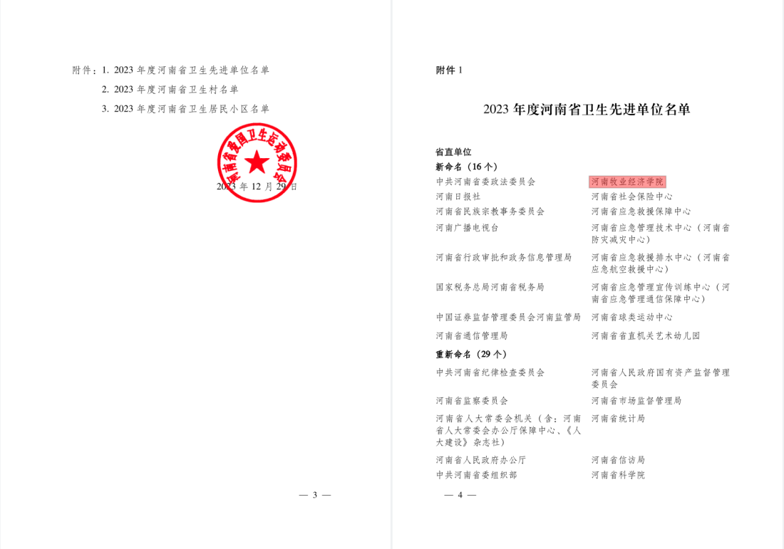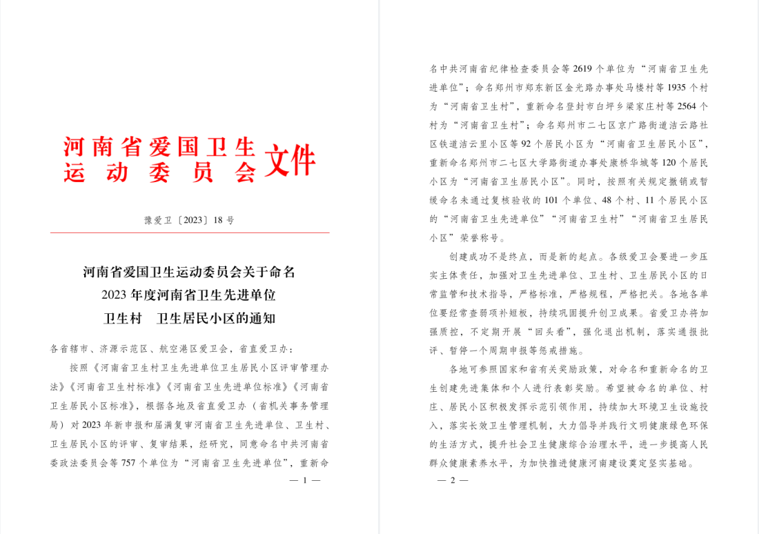 近日,河南省爱国卫生运动委员会下发了《关于命名2023年度河南省卫生先进单位、卫生村、卫生居民小区的通知》(豫爱卫〔2023〕18号),对全省范围内的卫生先进单位进行表彰。在此次表彰中,437ccm必赢国际官网被命名为“河南省卫生先进单位”荣誉称号。