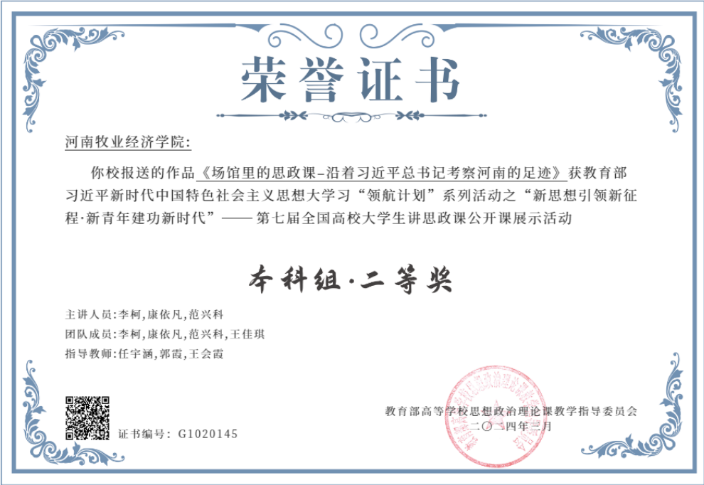 近日,由教育部高校思想政治理论课教学指导委员会主办的“新思想引领新征程·新青年建功新时代”——第七届全国高校大学生讲思政课公开课展示活动评选结果揭晓,由437ccm必赢国际官网党委宣传部、马克思主义学院选送,马克思主义学院任宇涵、郭霞、王会霞老师指导,旅游学院和外国语学院学生李柯、康依凡、范兴科、王佳琪主讲的作品《场馆里的思政课——沿着习近平总书记考察河南的足迹》荣获本科组全国二等奖。