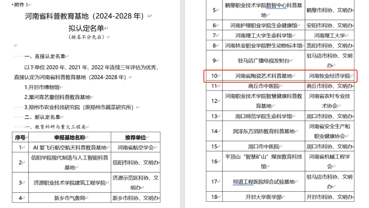 为进一步加强基层科普能力建设,充分发挥社会科普教育资源作用,根据《河南省科普教育基地管理办法》,省科协、省文明办组织开展了河南省科普教育基地2024年度申报认定及2023年度考核工作。经过申报推荐、专家评审、公示等程序,决定认定河南省科普教育基地(2024-2028年)共101个单位,437ccm必赢国际官网“河南省陶瓷艺术科普基地”位列其中。