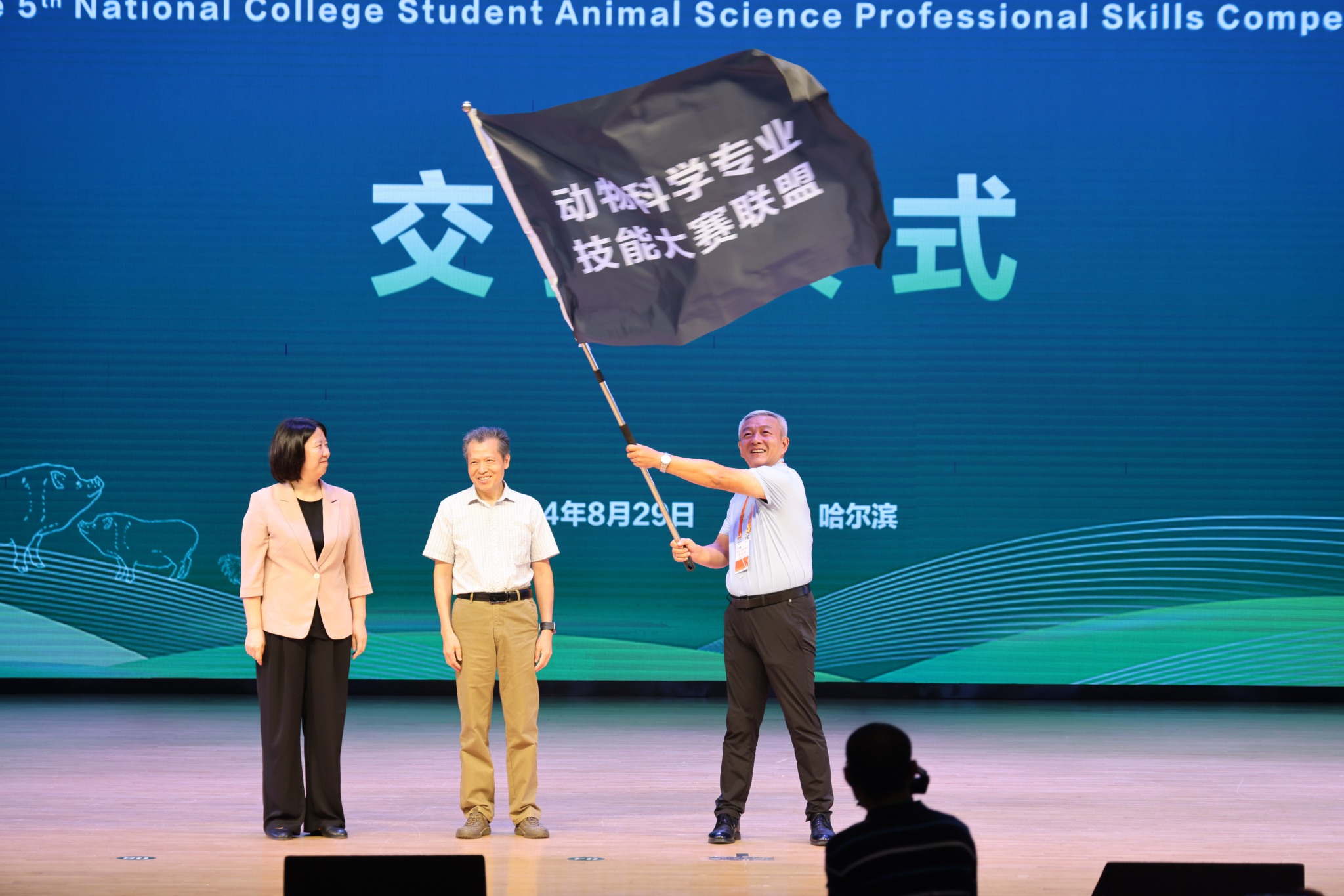 在交接仪式上,动物科技学院副院长邓红雨从教育部高等学校动物生产类专业教学指导委员会秘书长手中郑重接过象征荣誉与责任的会旗。邓红雨表示,学校将以此比赛为契机,借鉴经验,积极筹备、精心组织,为第六届全国大学生动物科学专业技能大赛的顺利举办做好充分而全面的准备,为推动中国动物科学教育事业的发展贡献更大的力量。