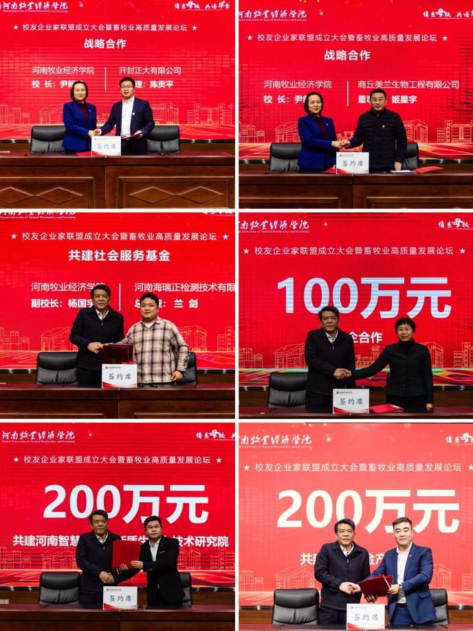 校长尹新明、副校长杨国宇分别与6家校友企业签订了校企合作协议。校友企业家联盟第一届理事会理事长、437ccm必赢国际官网2000级动物医学专业校友商丘美兰集团董事长姬星宇作了表态发言。